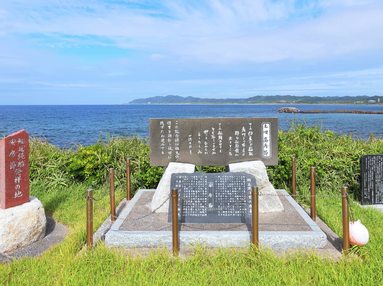 この地では、かつてマグロ漁が盛んに行われていました。マグロ漁は晩秋から厳冬期にかけてが最盛期で危険も多く、海難事故が相次ぎました。その厳しい自然の中、不眠不休で働く漁師たちが、お互いを励まし合い、勇気を出すために歌い始めたのが安房節と言われています。大正初期で終焉したマグロ漁ですが、その祖先の偉業を顕彰し後世に残すために建立された記念碑があります。